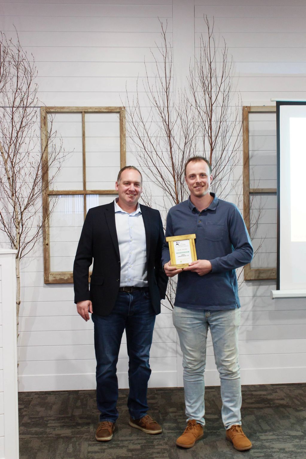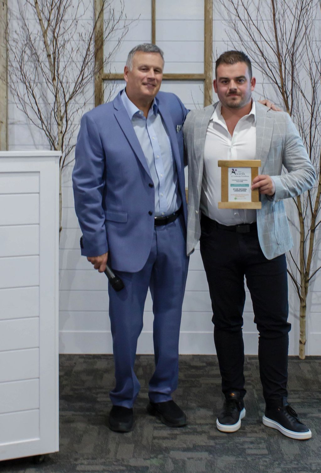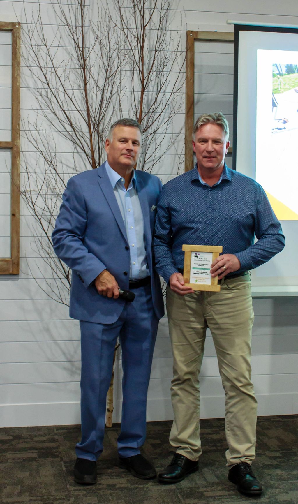Colin Murray from Envirem Organics (L) presents the Specialty Stone Work award to Zach Sweet for their project (R)
