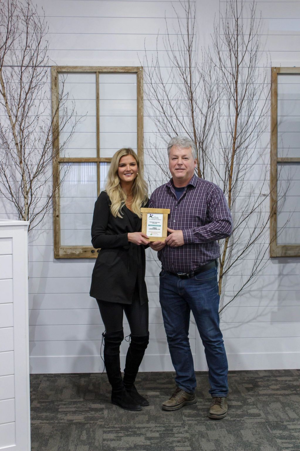 Jim (R) is presented his plaque by Kendall Underhill of Lounsbury Automotive Ltd. (L)